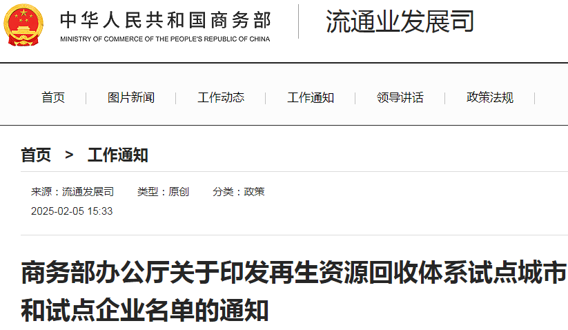 为贯彻落实党中央、国务院决策部署,按照商务部等 9部门《关于健全废旧家电家具等再生资源回收体系的通知》(商流通发〔2024〕18号)要求,经地方推荐、专家评审、社会公示,现将北京市(海淀区)等32个城市列入再生资源回收体系建设试点城市,北京云易达技术服务有限公司等78家企业列入再生资源回收体系建设试点企业。