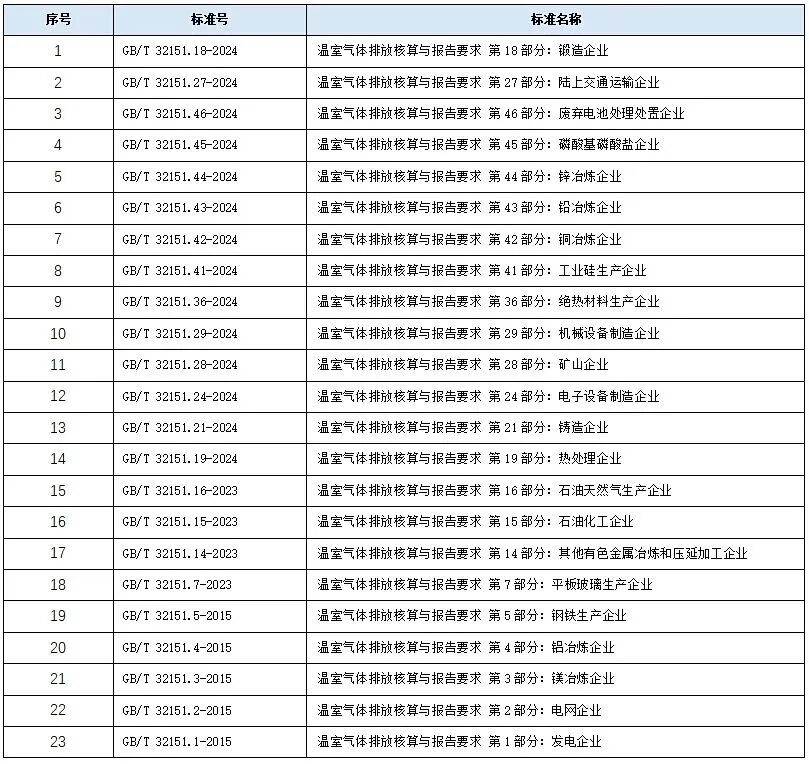 对于控排企业,GB/T 32150《工业企业温室气体排放核算和报告通则》是我国企业碳核算标准体系的核心基础标准。该标准于2015年正式发布实施,旨在为工业企业及相关行业开展温室气体核算与报告提供总体原则和方法框架,GB/T 32150为各行业标准的制定提供了统一术语、核算方法和报告框架。在此基础上,GB/T 32151系列《温室气体排放核算与报告要求》形成了涵盖不同产业的“子标准集合”,每一部分对应一个具体行业。目前我国已经发布45项企业温室气体排放核算与报告国家标准(总计约51项已发布/批准中),这些标准涉及能源、工业、交通、农业、废弃物处理等多个主要排放领域,基本实现对重点行业全面覆盖。