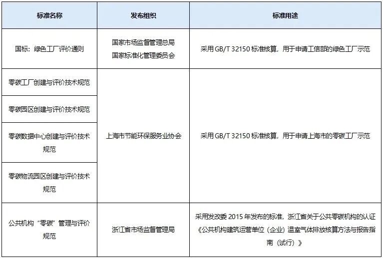 我国地方开展了以零碳工厂、零碳园区为代表的减排示范试点工作,此类标准大多基于GB/T32150编制,一般需基于地方试点政策中规定的标准进行核算与核查。