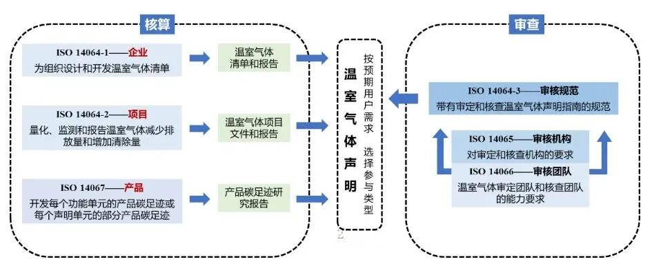 碳管理标准体系一般包含核算及审查两部分,以温室气体报告及声明为主要输出物。