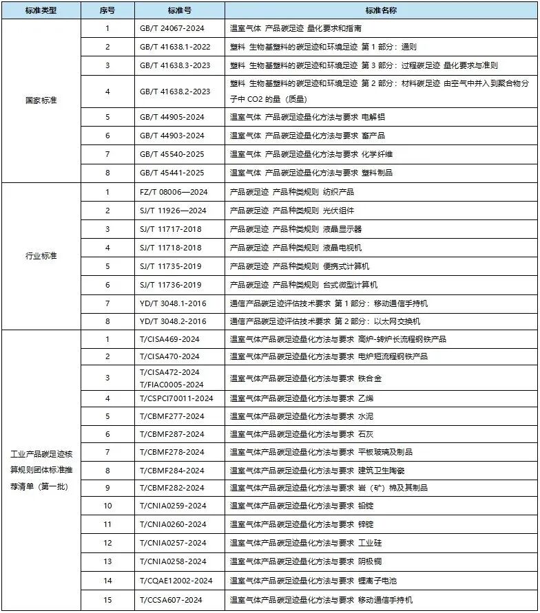 我国已发布的产品碳足迹国标/行标数量很少,目前国内PCR涵盖行业及数量有限,整体进度电子和通讯行业领先,适用汽车产品的标准尚处于制定阶段。工业和信息化部发布了液晶显示器、便携式计算机等四项电子行业标准,此外在标准不足情况下,为满足各行业碳足迹核算研究需求,2025年1月,工业和信息化部、生态环境部、国家发展改革委、市场监管总局联合发布《工业产品碳足迹核算规则团体标准推荐清单(第一批)》15项团体标准。