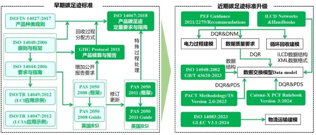 国际产品碳足迹标准以PAS2050系列标准及ISO系列标准为基础,逐渐演化更新到ISO 14067系列标准,为建立规范、统一的LCA体系,保证LCA结果可信度与可比性,PEF Guidance等标准在前期标准基础上进一步提出了数据质量要求、数据结构、数据质量评估体系(Data Quality Rating, DQR)等方面的要求,进一步完善及深化了标准核算过程。